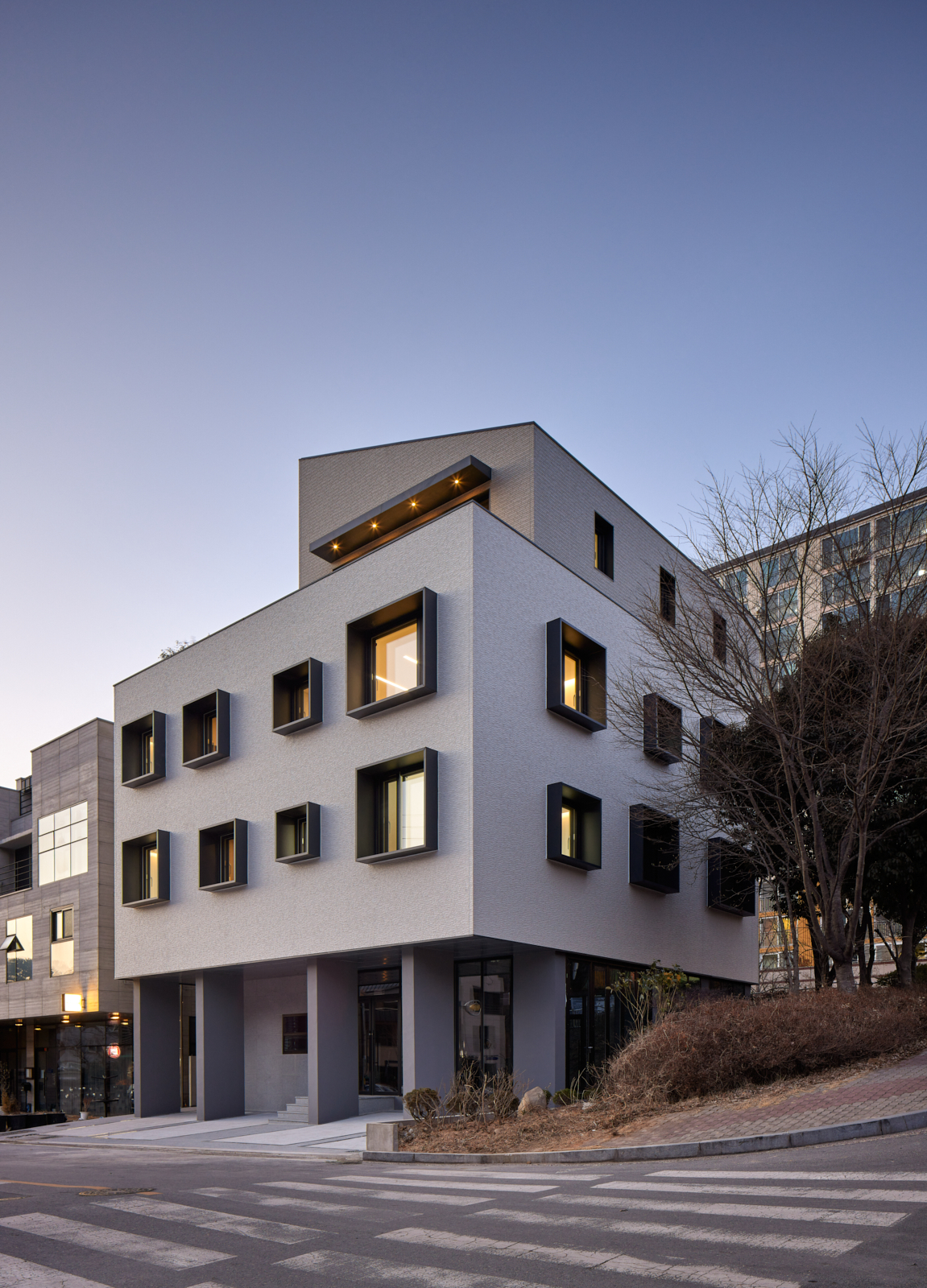 50평이 채 안되는 작은 땅이지만, 건축주는 건물이 커 보이길 원했습니다. 사선제한이라는 장애물도 있었습니다. 이러한 제약 속 건축주의 희망사항인 '커 보이는 건물'을 실현하기 위해 건물을 여러 덩어리들이 조합되어 있는 것처럼 디자인했습니다. 묵직한 덩어리감은 거대하다는 인상을 줄 수 있습니다. VT Cosmetics 신사동 사옥은 일곱개의 기다란 덩어리가 덧붙고 덧붙어 몸집을 부풀린 모습입니다. 이 독특한 외관은 도심 속 작은 필지에서도 기업의 존재감을 드러낼 수 있습니다.