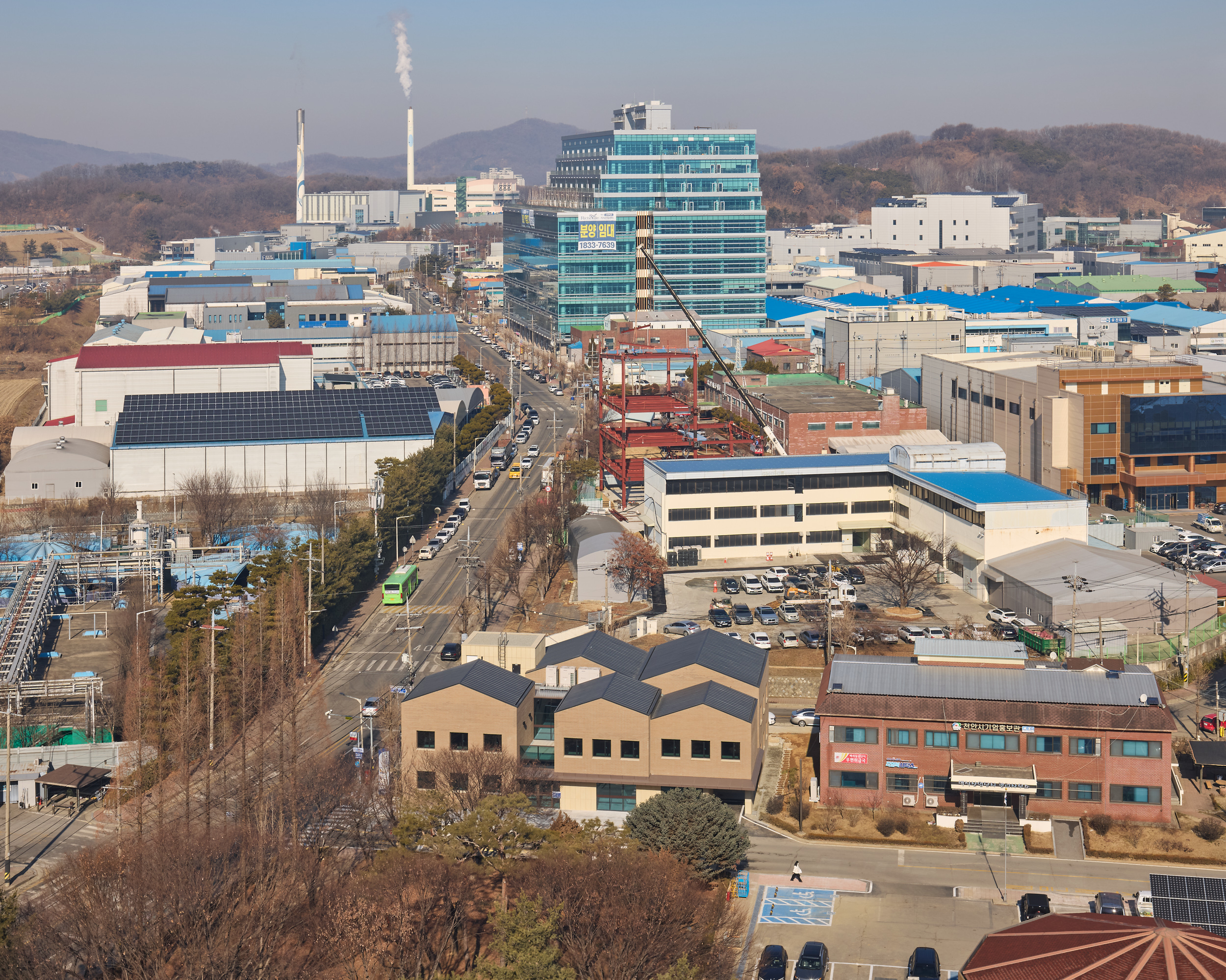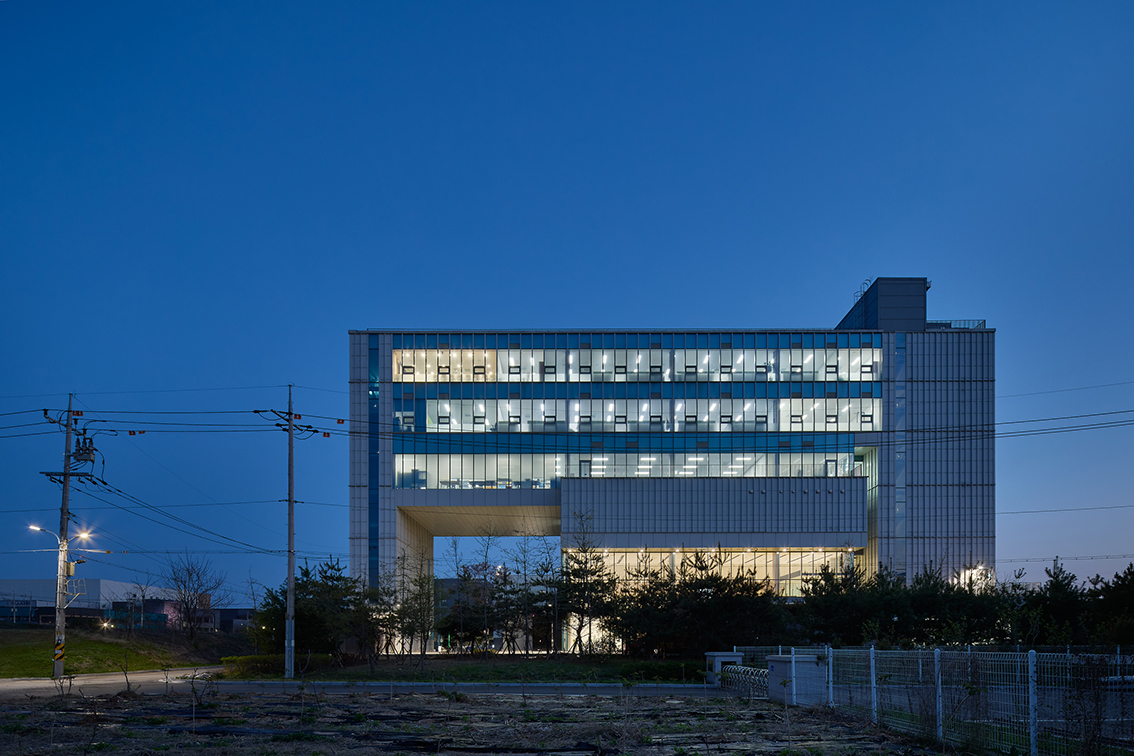 1단계에 신축한 건물은 지하 1층, 지상 6층 규모입니다. 지하 1층부터 지상 3층까지는 생산공간으로 사용하고, 그 위에 세 개 층의 사무동을 두었습니다. 설비를 위한 공간(공장동)과 사람을 위한 공간(사무동)을 나눠 공장동은 산업단지를 면한 앞쪽에, 사무동은 경치가 좋은 뒤쪽에 배치하였습니다. 이러한 설계 전략은 근무 환경에 대한 만족도를 끌어올리면서도 생산성을 높일 수 있습니다.