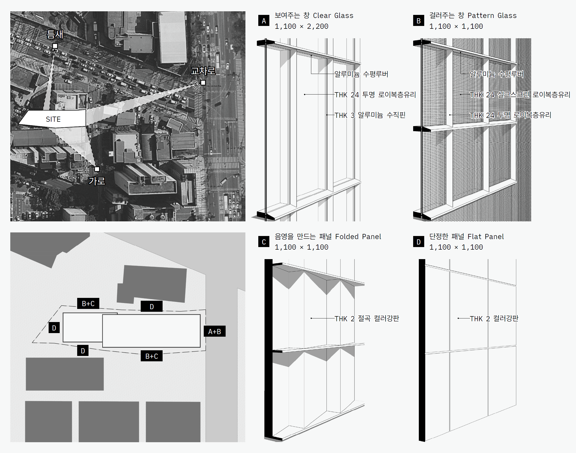 우리는 이런 도시의 틈새에 대응하는 방식을 고민했습니다. 먼저 건물의 외피를 네 가지 유형(A-보여주는 창, B-걸러주는 창, C-음영을 만드는 패널, D-단정한 패널)으로 구분하고, 주변 상황과 내부 공간에 맞게 조합해서 외관을 만들었습니다. 각 유형별로 투명한지(A) 아닌지(B), 굴곡이 있는지(C) 평평한지(D)가 다르지만, 각각의 입면 요소는 가로 세로의 길이를 각각 1100mm로 맞췄기 때문에 전체가 하나의 외피 시스템으로 통합됩니다.
