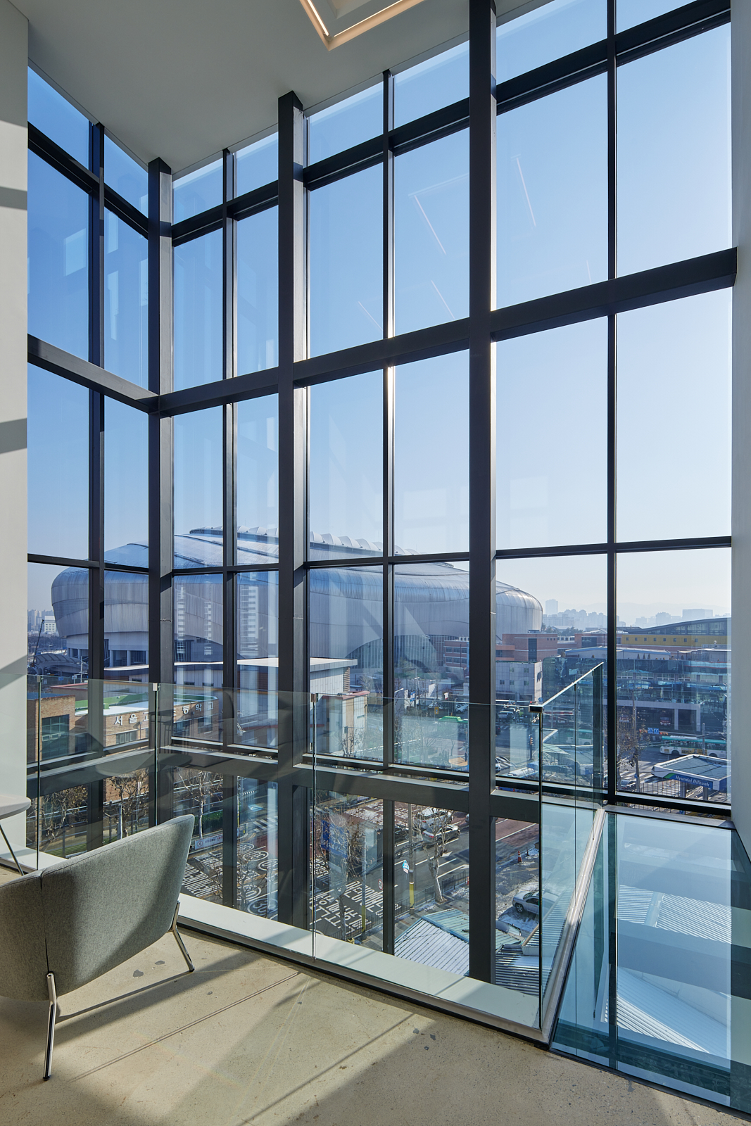 높은 층고의 사무실에는 실크스크린 유리 커튼월(B)을 설치해 주변의 불편한 시선은 거르고 채광은 충분히 들어오게 했습니다.