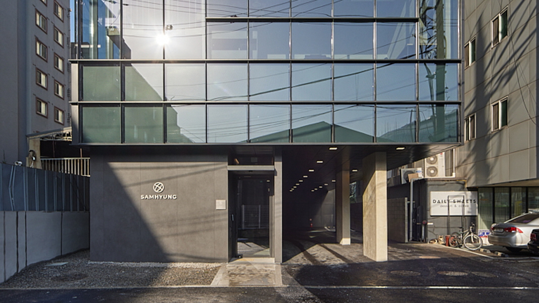 삼형전자 사옥은 구로구 고척동의 큰 도로에서 한 칸 안쪽으로 들어와 있습니다. 건폐율과 용적률이 높은 지역이어서 주변에는 큰 건물들이 많이 있습니다. 복잡한 도심지에서 건물 전체를 한 눈에 볼 수 있는 경우는 흔치 않습니다. 우리의 경우도 마찬가지였습니다. 저 멀리 교차로에서는 건물의 상부가 보이고, 대로변에서는 높고 낮은 주변 건물들 사이로 측면이 겨우 노출되고, 가까이 다가와서는 길에 면한 건물의 일부분만 보이는 식입니다.