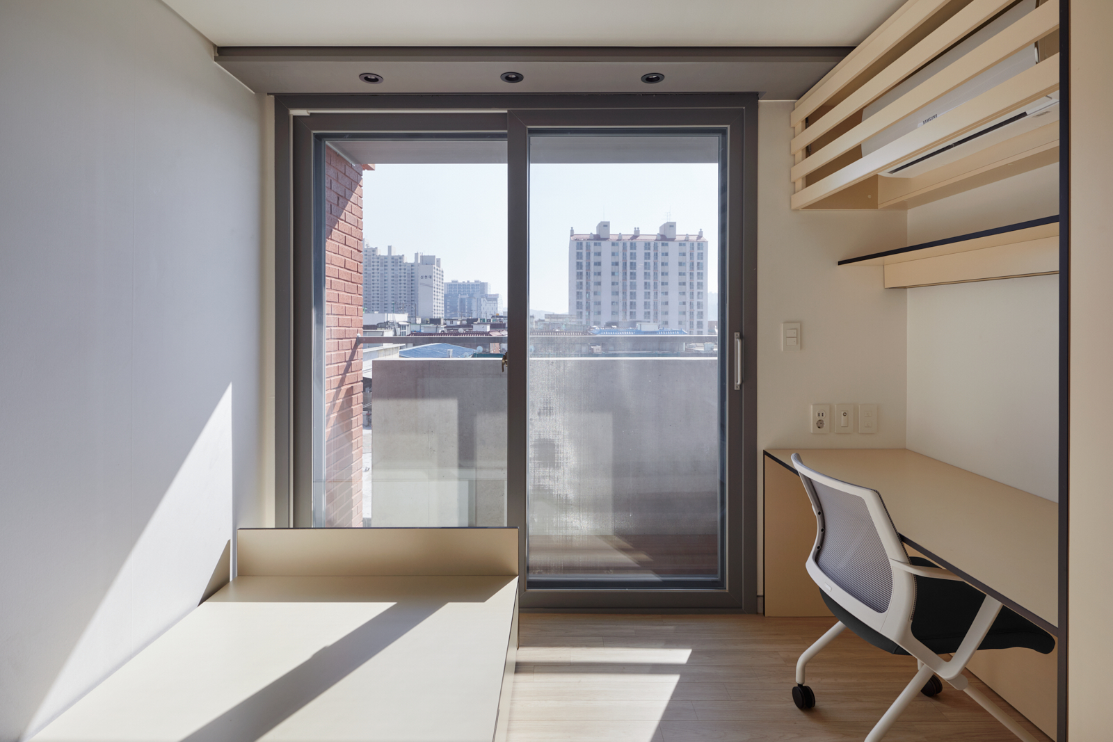 “직원 기숙사이기 때문에 거실이나 주방 같은 공간이 집의 중심이 되면, 퇴근하고도 상사와 저녁밥을 같이 먹어야만 하는 불편한 집이 될 것 같았다. 작더라도 쾌적한 온전히 나만을 위한 공간을 만들기 위해 발코니가 있는 개인실을 남쪽 전면에 배치하고, 나머지 공간은 복도 건너편(북쪽)에 두어 선택적으로 공동체에 참여하도록 했다.”