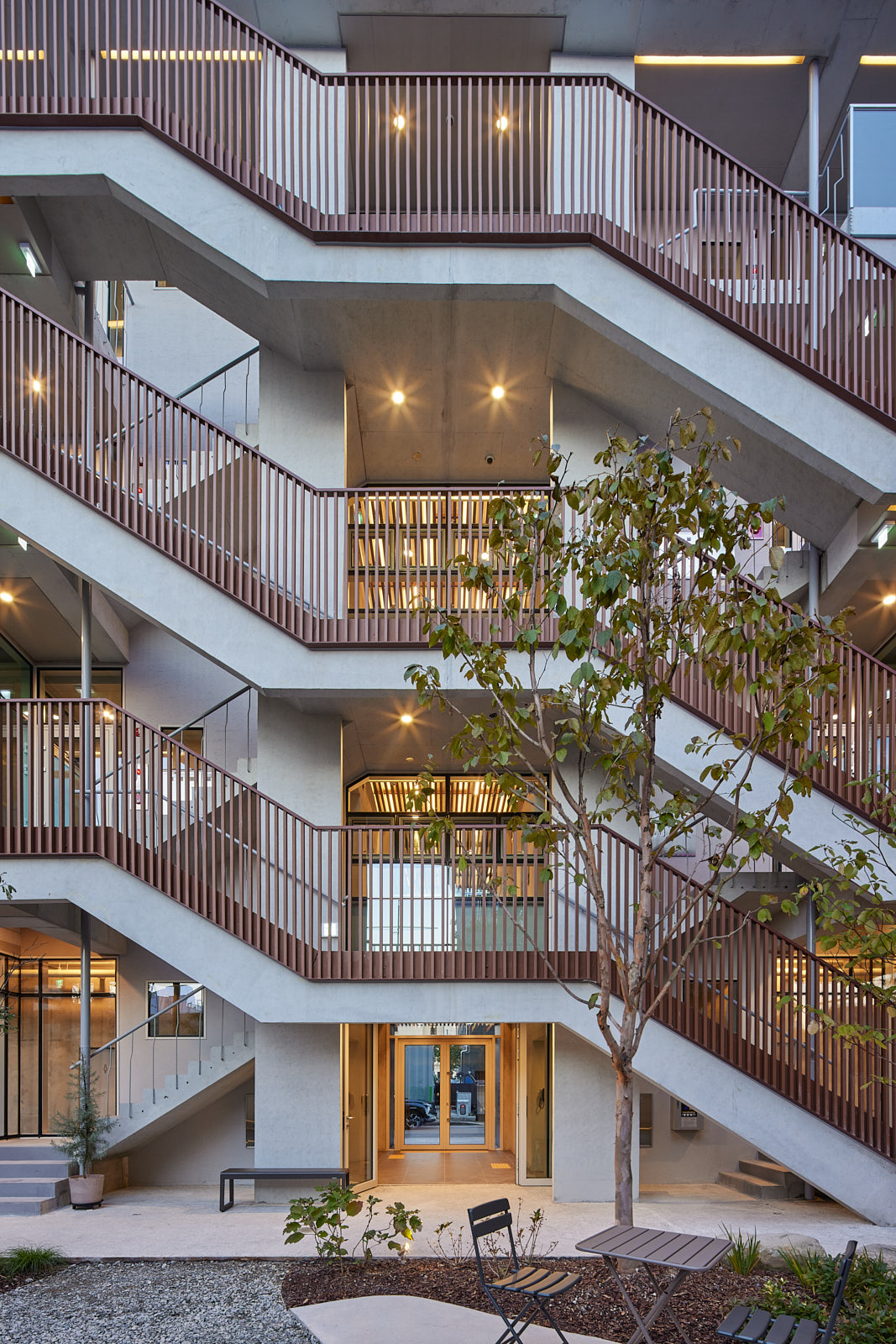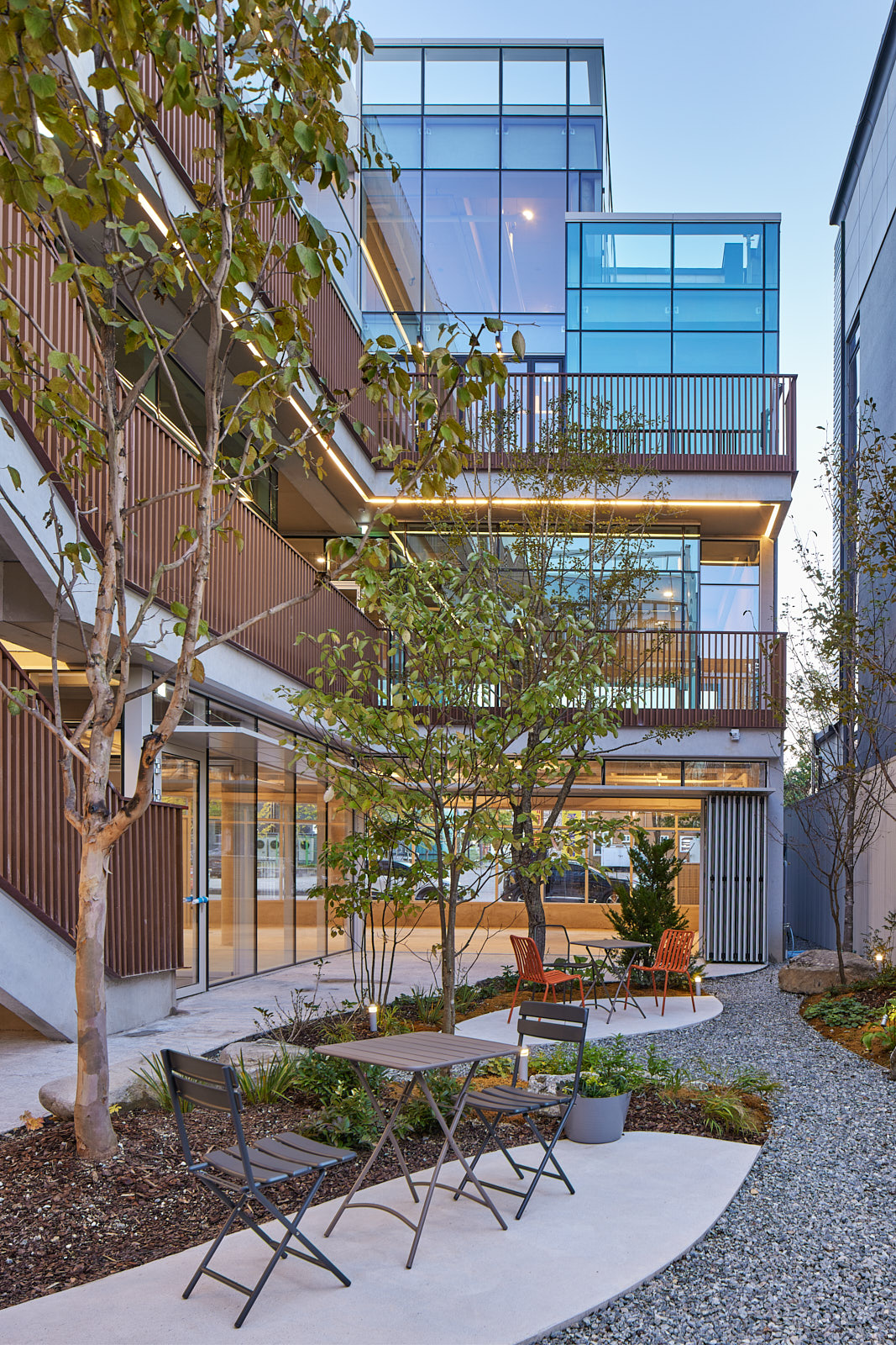 건물 뒤편을 칙칙하게 방치하지 않고 남김없이 이용하도록 정원을 꾸렸습니다. 뒤편의 비밀스러운 정원은 밖에서 봤을 때 전혀 예상치 못한 볼거리가 됩니다. 1층부터 4층까지 연결된 계단에서는 산책로를 걷듯 정원을 구경하며 오르내릴 수 있죠. 사실 맞벽건축은 건물마다 계단을 따로따로 만들어야합니다. 조양동 근린생활시설의 계단은 하나의 큰 계단처럼 보이지만, 이 역시 두 계단으로 이뤄졌습니다. 계단 두 개를 대칭으로 만들면 서로 등을 돌린 듯 보이지만, 계단 하나를 뒤집으면 두 계단이 하나로 이어진 듯 보이게 됩니다.