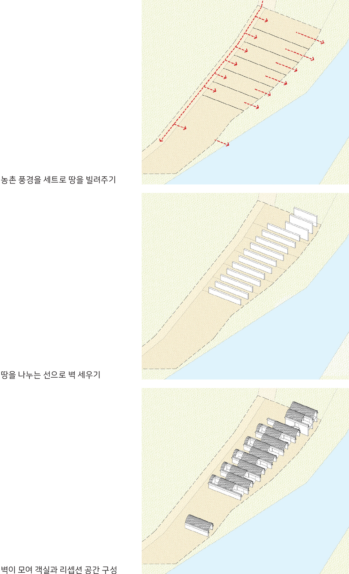 1700여 평에 이르는 전체 대지를 현명하게 나눠 쓰고자 여러 대안을 검토한 결과, 대지 가운데를 중심으로 건축하기로 했습니다. 건물은 숙소 성격-내외부 공간이 오밀조밀한 유형, 내외부 공간이 널찍널찍한 유형-에 따라 적절한 자리에 배치되었습니다.