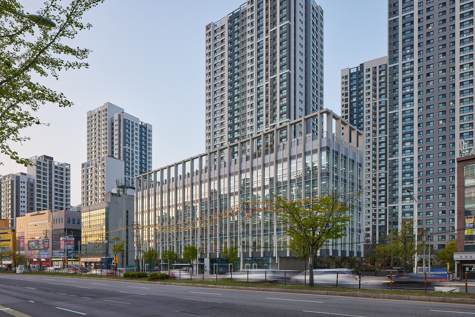 비산동 의료시설의 부지는 왕복 10차선의 대로변에 면한 길이가 75m나 되는 긴 땅입니다. 건물이 노출되는 면적이 클수록 수익이 올라가는 임대용 건물을 짓기에는 최적의 조건이라고 할 수 있죠. 그러나 부지의 폭이 16m~20m 밖에 되지 않는 것이 문제였습니다. 거기에 더해서 경관지구로 지정되어 있기 때문에 대지 경계선으로부터 2m를 물러나서 건물을 지어야 했습니다.