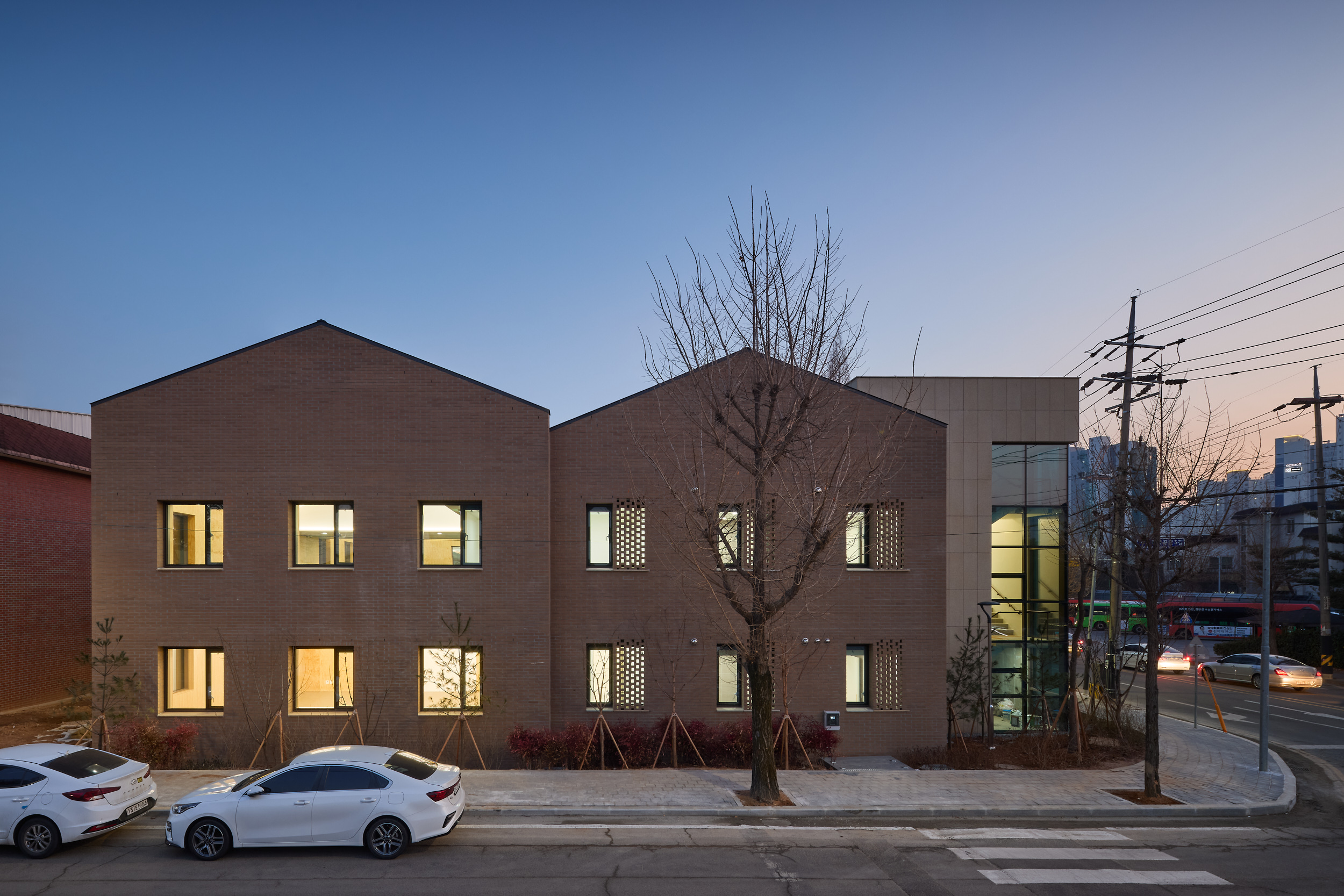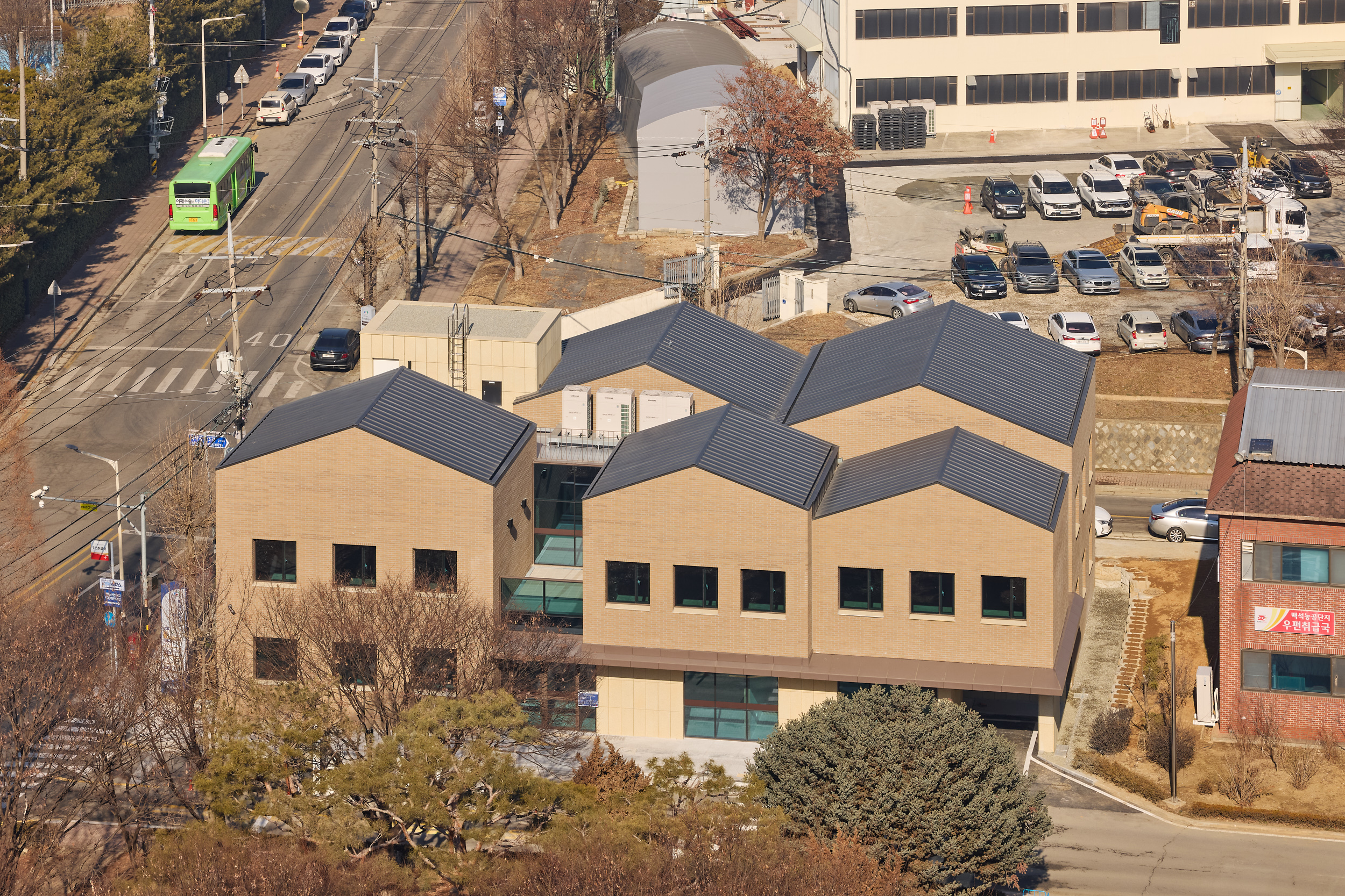우리는 전면 도로변에 보훈단체를 위한 출입구와 라운지를 만들어서, 보훈회관 방문객들로 하여금 마치 이 건물 전체가 보훈회관인 것처럼 느껴지도록 했습니다. 반면 장애아동 센터는 큰 도로변에서 한켠 안쪽에 있는 중정을 통해서 안전하게 보호받으면서 진입하도록 했어요.