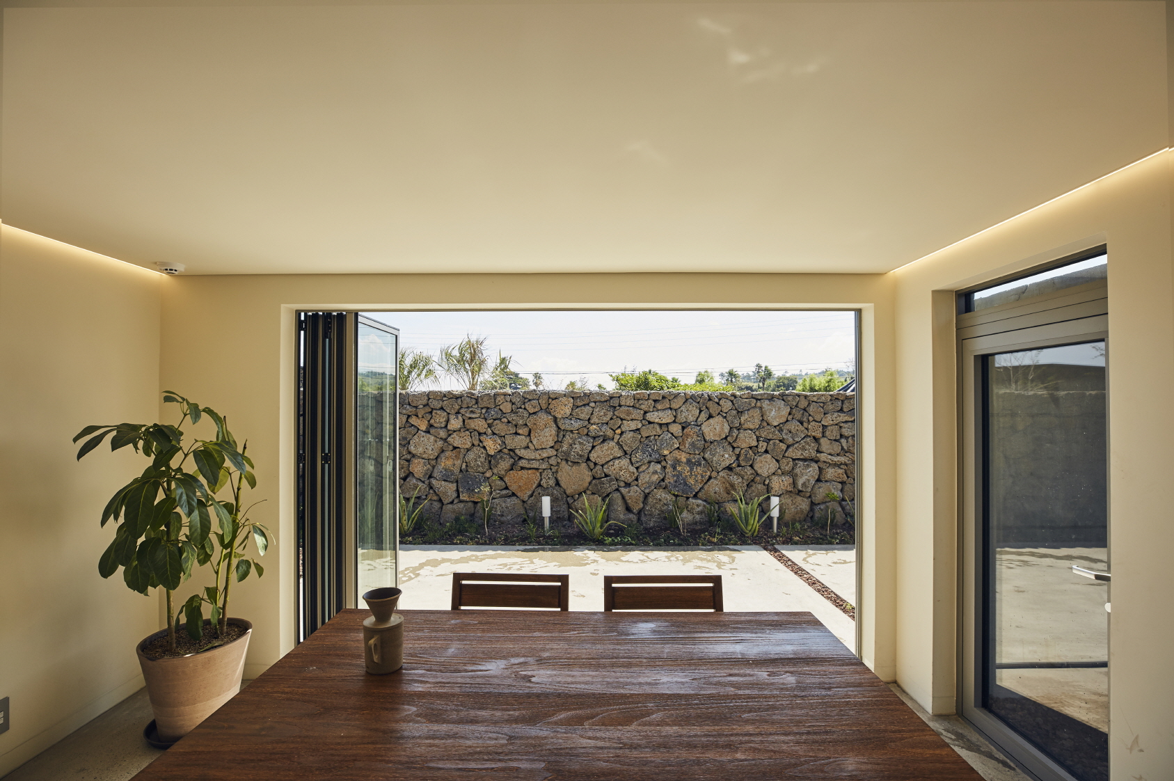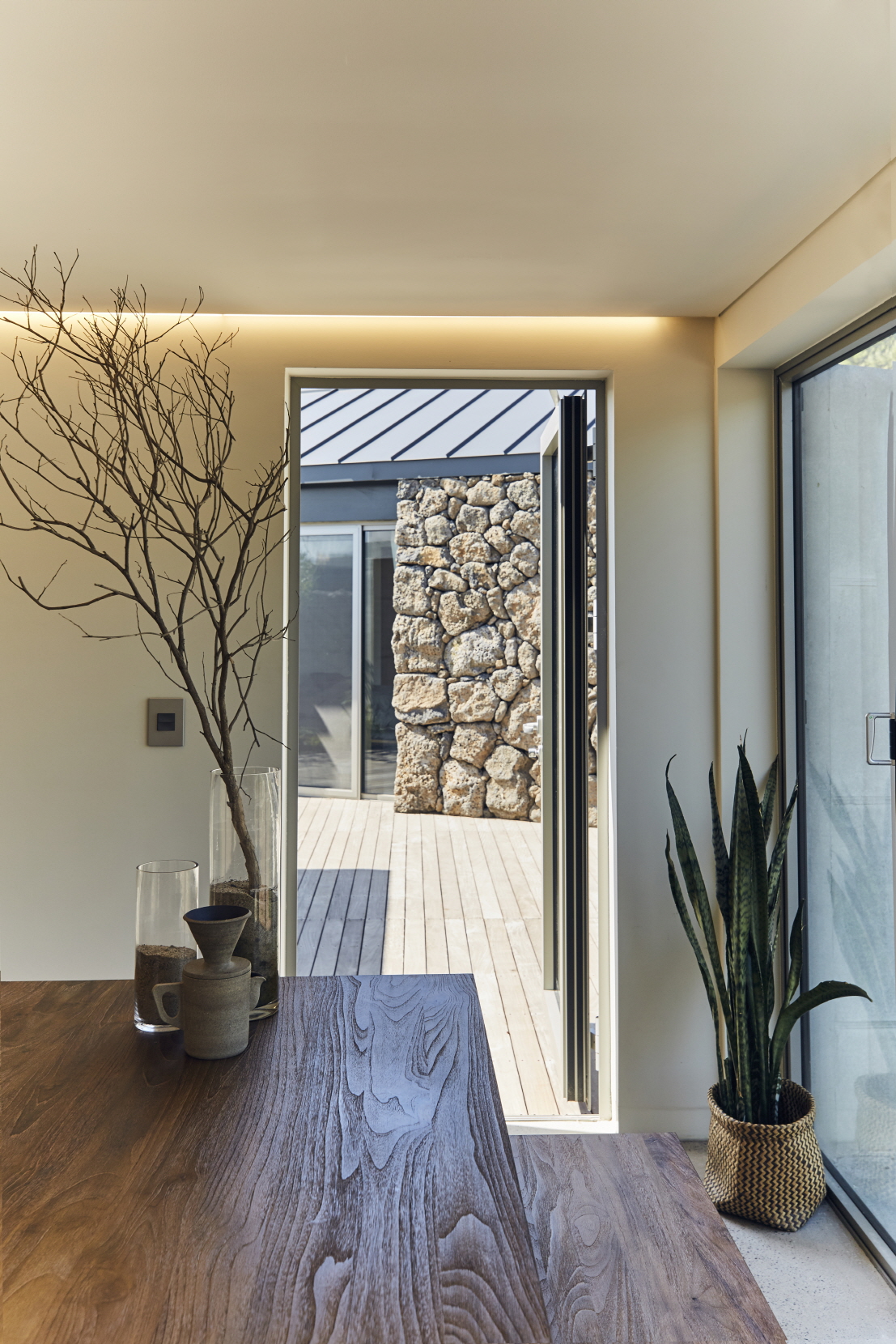 오롯이 쉴 수 있는 나만의 공간이 콘셉트였기에 어떻게 나만의 공간을 만들 수 있을지 고민했습니다. 내외부 공간이 오밀조밀한 숙소는 “벽이 손에 닿을 듯 가까이 있을 때” 안온하며 비로소 혼자라고 느끼는 사람을 위한 곳입니다. 여행객은 미로같은 돌담을 따라 나만의 도피처로 들어가게 되죠. 침실, 거실, 마당, 노천탕 등 모든 공간이 잘게 나뉘어 위요감, 즉 벽으로 둘러싸인 아늑함을 느낄 수 있습니다.