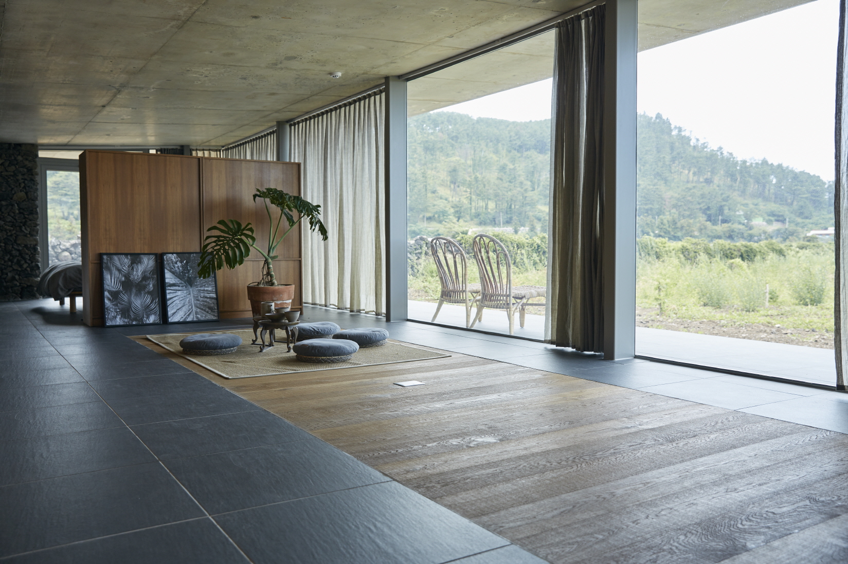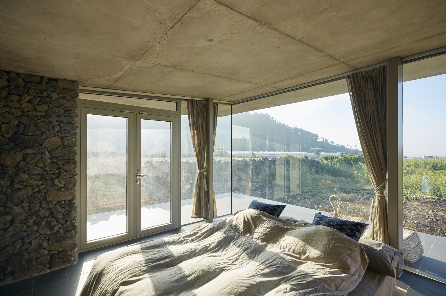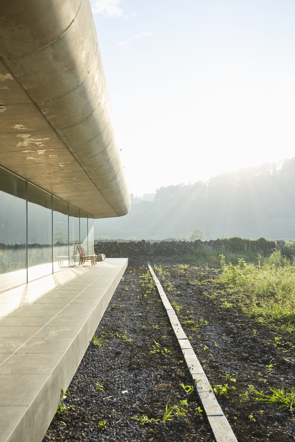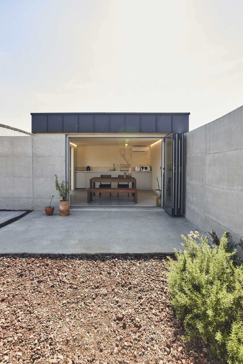 내외부 공간이 널찍널찍한 숙소는 마치 나 혼자 지구에 뚝 떨어져 있는 듯한 느낌을 줍니다. 내부는 그 어떤 구획없이 트여있고, 외부에는 900평의 드넓은 들판과 그너머 바다가 펼쳐져 있죠. 도로에 접하지 않은 맹지는 오히려 프라이빗한 마당으로 활용되었습니다. “광활한 공간이 펼쳐지고 거기 아무도 없다는 걸 눈으로 확인해야 비로소 혼자”라고 느끼는 사람을 위해서요.