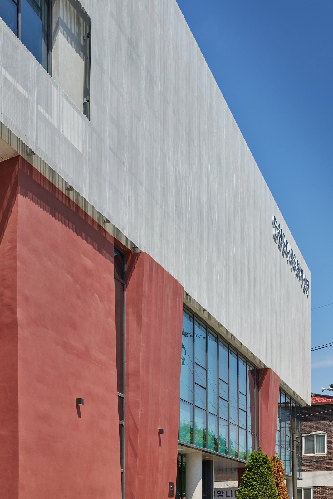 건물의 상부는 알루미늄 타공패널을 활용한 외피를 적용하여 전체 시설을 통합하는 상징적인 건축물로 계획했고, 컬러노출콘크리트와 투명 유리가 조합된 저층부는 공중에 떠있는 매스를 지지합니다.