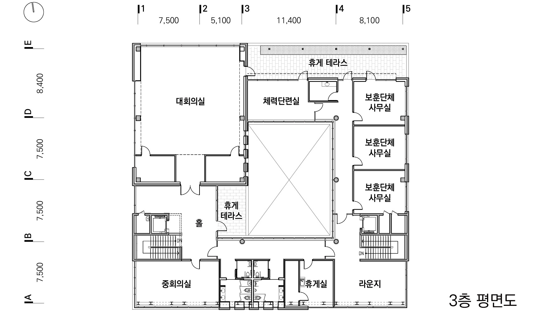 3층 매스의 코너부에 층간 트러스를 활용한 캔틸레버 구조를 적용하여 저층부 2개층의 코너를 개방시켰고, 트러스 구조를 3층 라운지에서 그대로 드러내어 공간의 이유가 그대로 설명되도록 하였습니다.