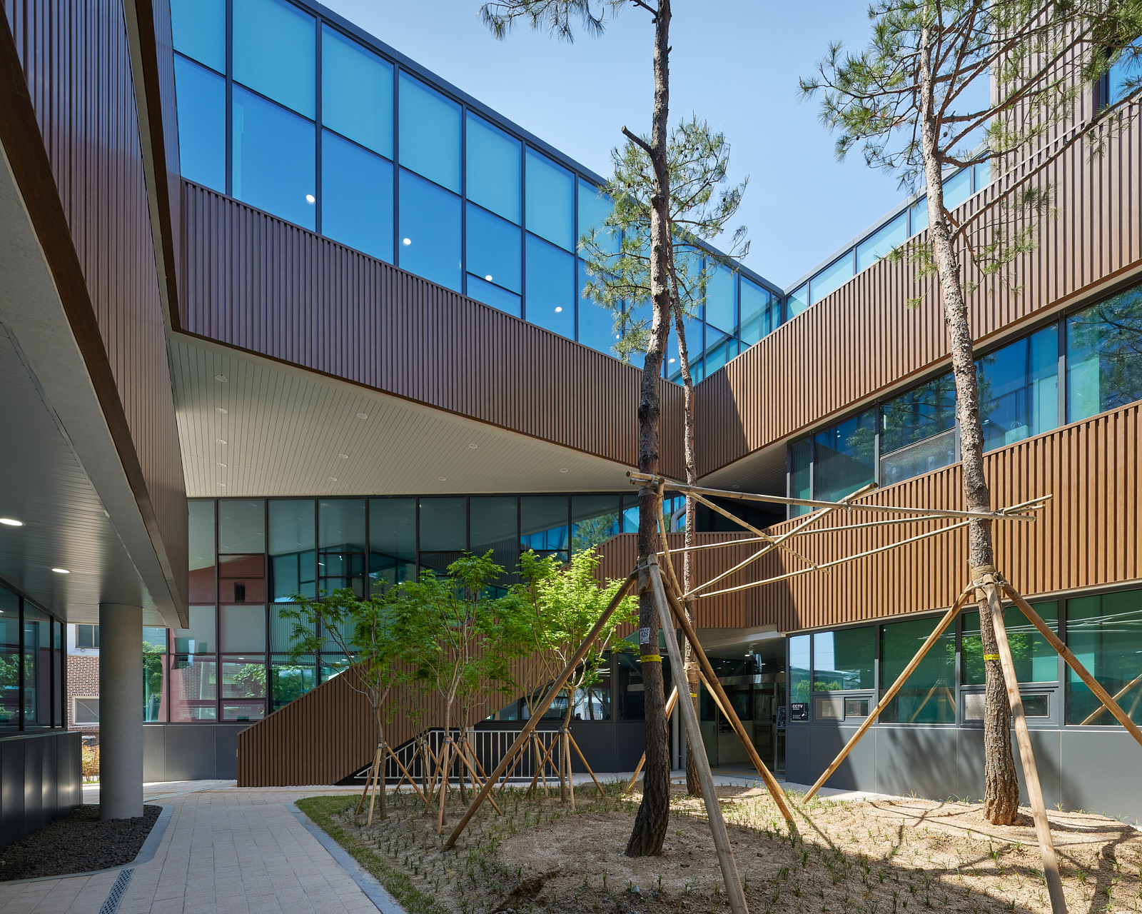 중정 내부는 따뜻한 공간의 분위기를 위해 목재 패널을 적용하여 외부로부터 분리되어 있는 따뜻하고 안전한 공간에 들어와 있는 듯한 느낌을 줄 수 있도록 계획했어요.